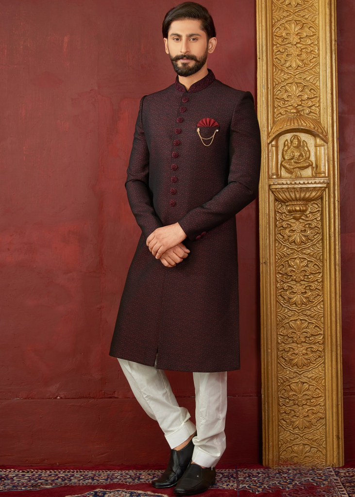 The most glamorous style is plain black sherwani paired with white shalwar kameez. They are much better fitting that the kurta, designed to show off the contours of the chest muscles; it is an outfit impossible to look bad in since it is designed to bring out the best side of any man who wears it.